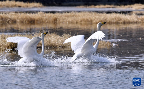 3月4日,天鵝在密云水庫流域的清水河嬉戲。(新華社記者 李欣 攝)