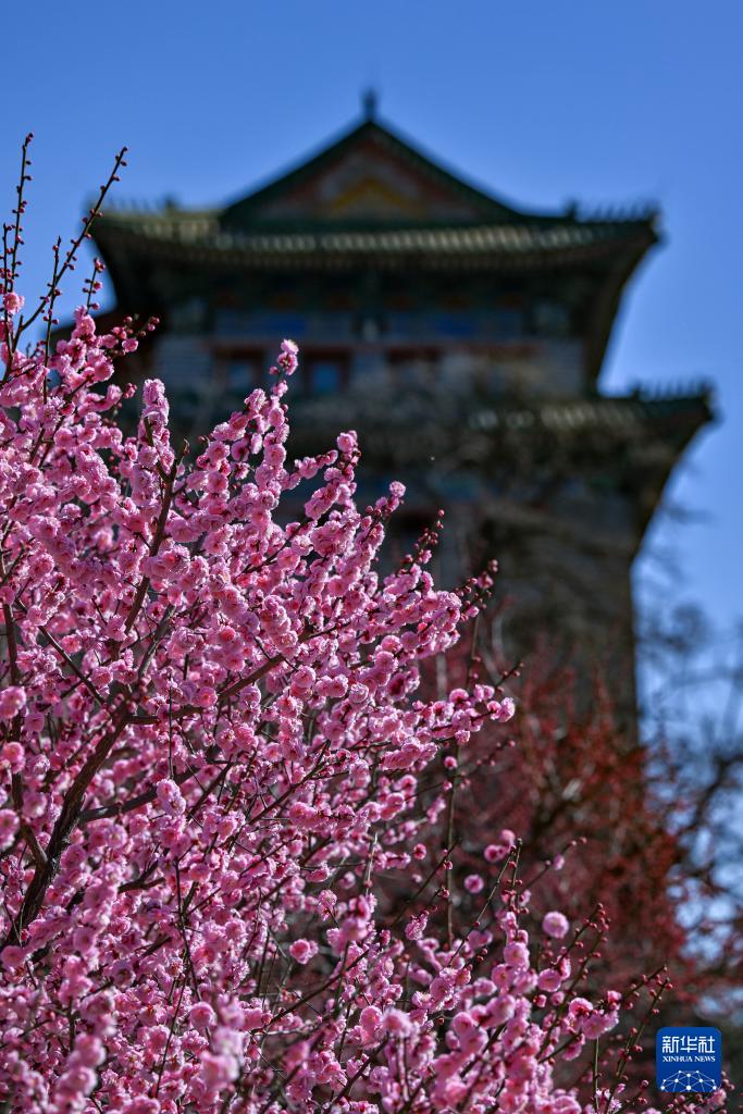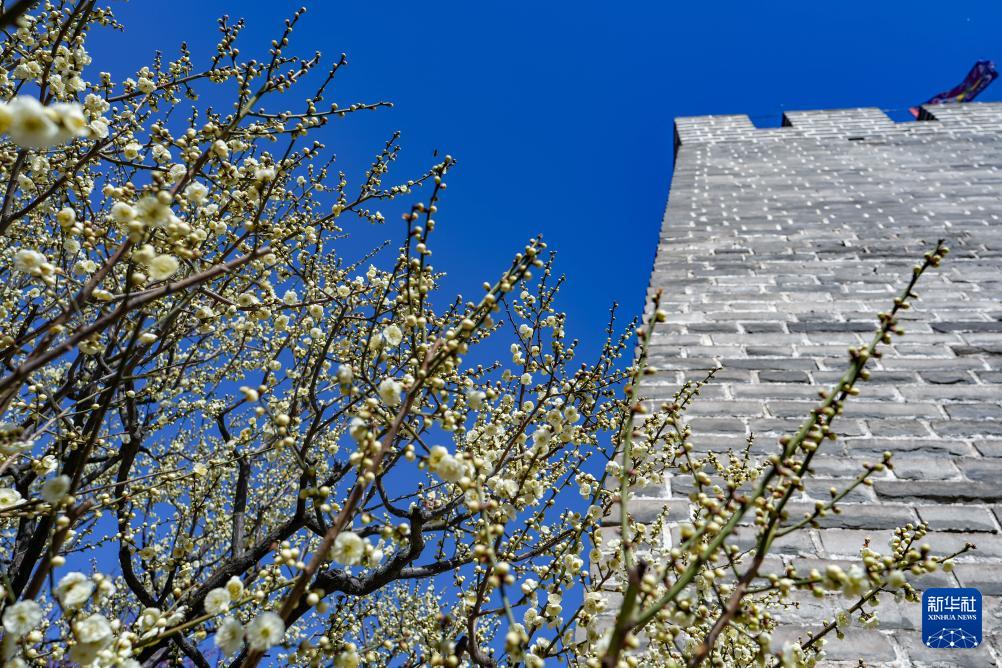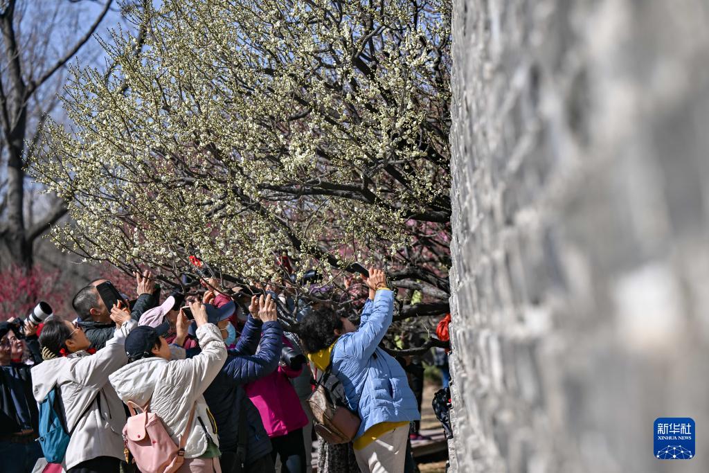 3月12日,人們在北京明城墻遺址公園賞花拍照。(新華社記者 張鋮 攝)