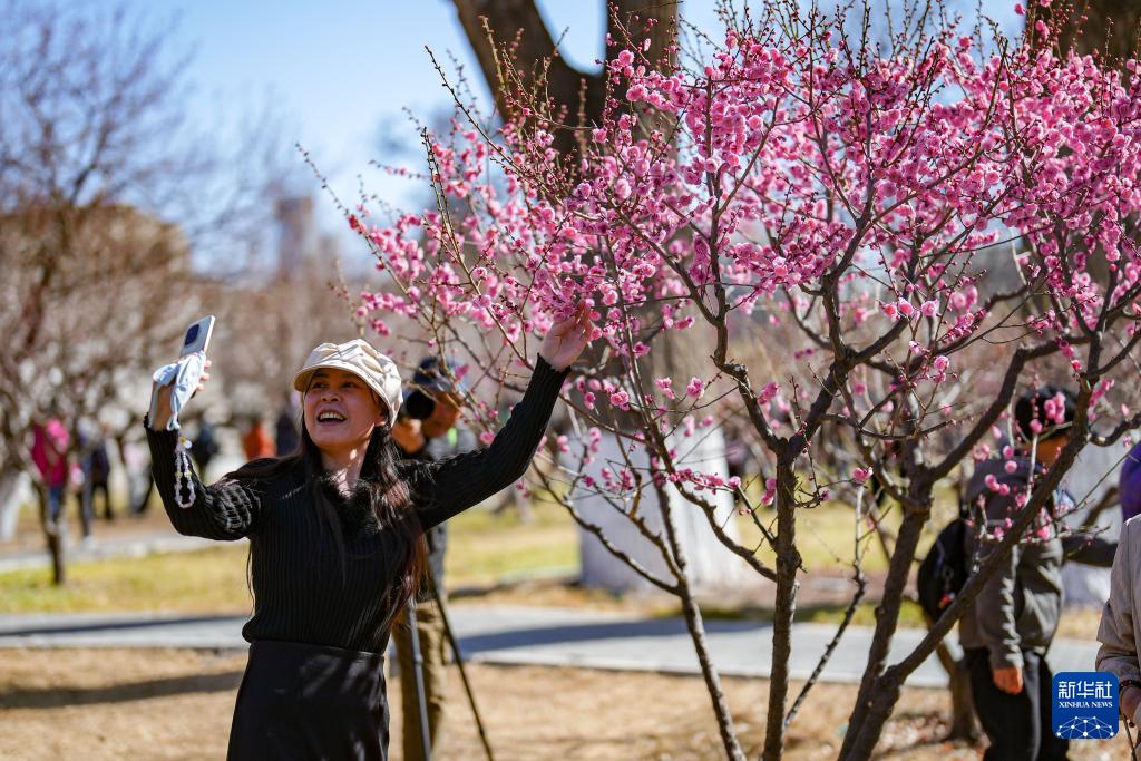 3月12日,一名游客在北京明城墻遺址公園賞花自拍。(新華社記者 張鋮 攝)