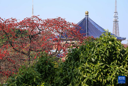 木棉花與廣州中山紀(jì)念堂相映成趣(3月19日攝)。(新華社記者 鄧華 攝)