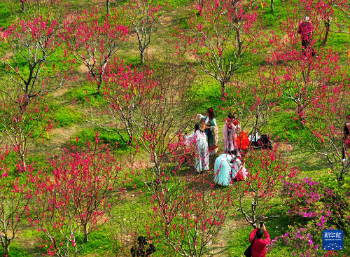3月19日,游客在廣西南寧市青秀山風(fēng)景區(qū)觀賞桃花(無人機(jī)照片)。(新華社記者 周華 攝)