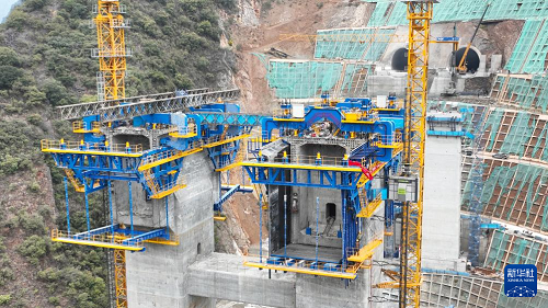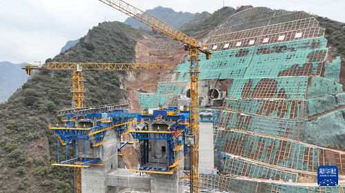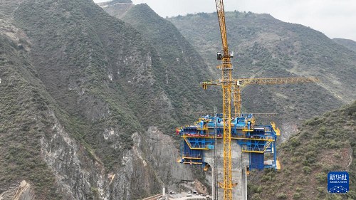 這是3月31日在渝昆高鐵洛澤河特大橋懸臂澆筑施工現(xiàn)場拍攝的“虹鷹1號(hào)”智能懸臂筑橋機(jī)(無人機(jī)照片)。(新華社發(fā) 彭洪 攝)