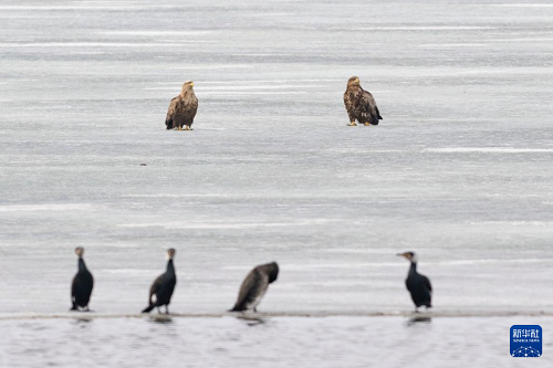 這是4月1日拍攝的興凱湖國家級(jí)自然保護(hù)區(qū)內(nèi)的白尾海雕(上)與普通鸕鶿。(新華社記者 謝劍飛 攝)