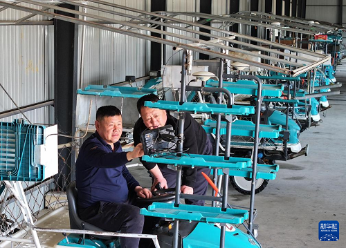4月7日,在北大荒集團黑龍江綏濱農場有限公司東井管理區(qū),農機檢修人員為種植戶校對高速插秧機上安裝的北斗智能導航系統(tǒng)(無人機照片)。(新華社發(fā) 李興 攝)