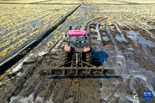 4月7日,在黑龍江北大荒農業(yè)股份有限公司友誼分公司第十管理區(qū)水稻田中,一臺農機在平整土地(無人機照片)。(新華社發(fā) 徐宏宇 攝)