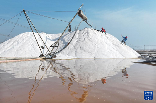 連日來(lái),在江蘇省連云港市灌西鹽場(chǎng)1.5萬(wàn)畝鹽田上,工人們搶抓晴好天氣,加緊進(jìn)行春季扒鹽作業(yè)。