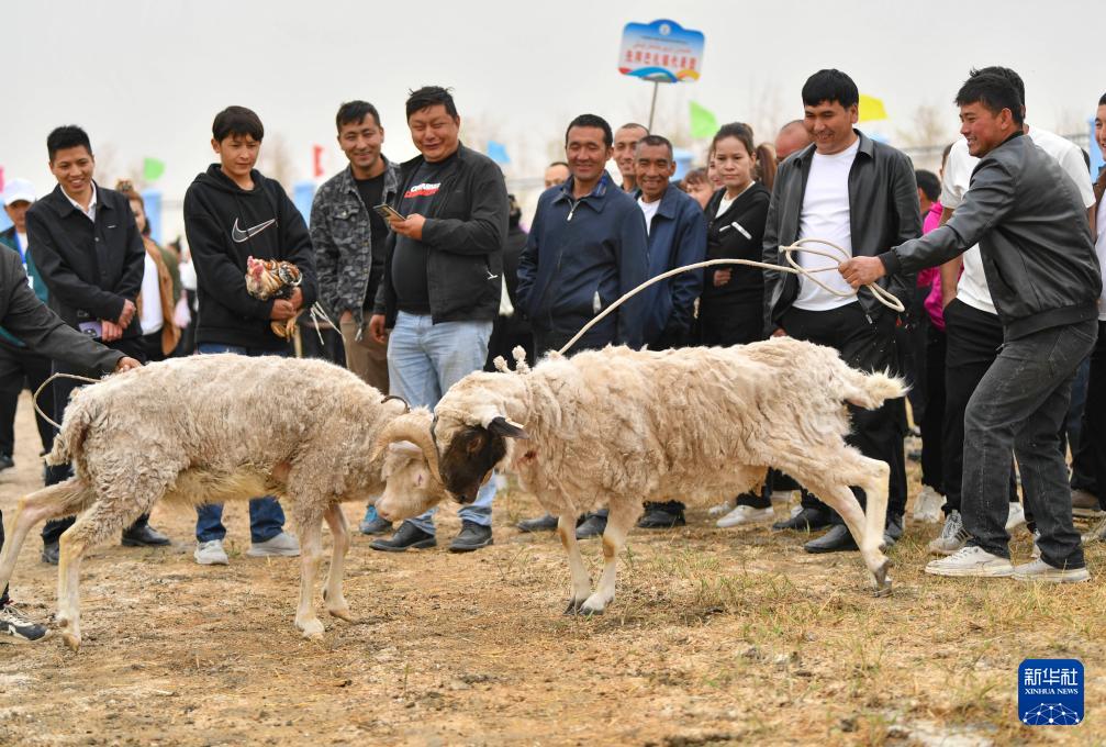 4月12日,人們?cè)谛陆谔锟h先拜巴扎鎮(zhèn)農(nóng)牧民運(yùn)動(dòng)場觀看斗羊比賽。(新華社記者 胡虎虎 攝)