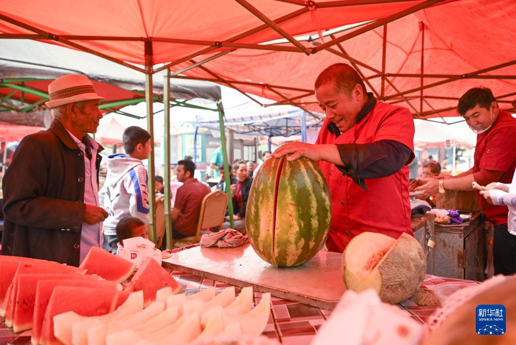 4月13日,一位商販在新疆于田縣先拜巴扎鎮(zhèn)農(nóng)牧民運(yùn)動(dòng)場賣水果。(新華社記者 胡虎虎 攝)