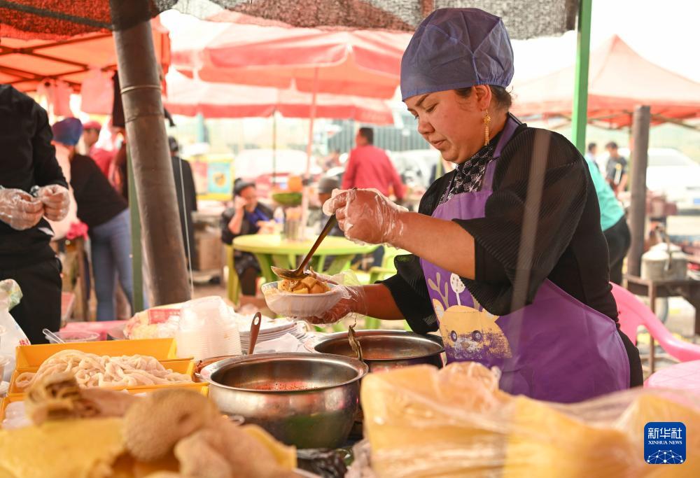 4月13日,一位商販在新疆于田縣先拜巴扎鎮(zhèn)農(nóng)牧民運(yùn)動(dòng)場為顧客制作面食。(新華社記者 胡虎虎 攝)