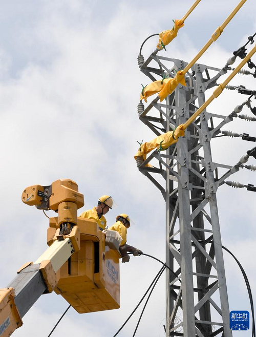 4月17日,在海南省陵水黎族自治縣華電陵水59.9MW分布式光伏發(fā)電項目現場,電力工作人員進行帶電接火作業(yè)。(新華社記者 趙穎全 攝)