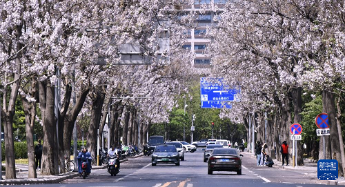 4月17日拍攝的泡桐花盛開的宏達路。(新華社記者 李欣 攝)
