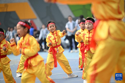 4月20日,孩子在親子運(yùn)動會上進(jìn)行武術(shù)表演。(新華社記者 金良快 攝)