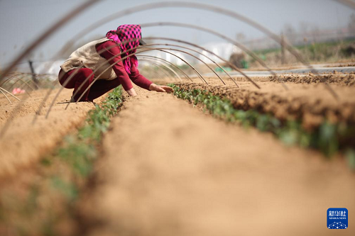 4月20日,在山東省威海市文登區(qū)澤頭鎮(zhèn)東團(tuán)嵐埠村的一處田地里,農(nóng)戶在栽植辣椒苗。(新華社發(fā) 陳宏青 攝)