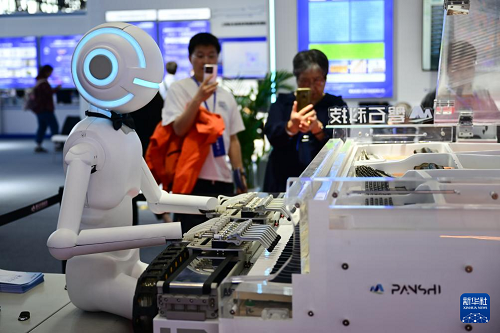 4月26日,觀眾在第三屆中國(安徽)科技創(chuàng)新成果轉(zhuǎn)化交易會上觀賞一款彈鋼琴的機(jī)器人。(新華社記者 周牧 攝)