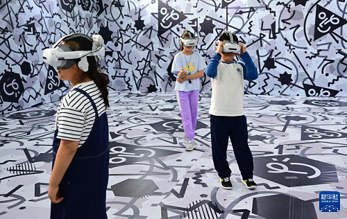 4月26日,小朋友們在第三屆中國(安徽)科技創(chuàng)新成果轉(zhuǎn)化交易會上體驗(yàn)VR設(shè)備。(新華社記者 周牧 攝)