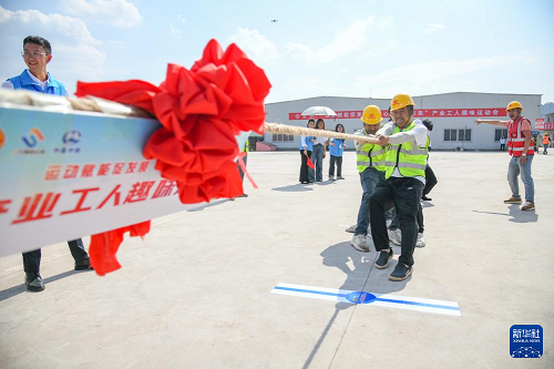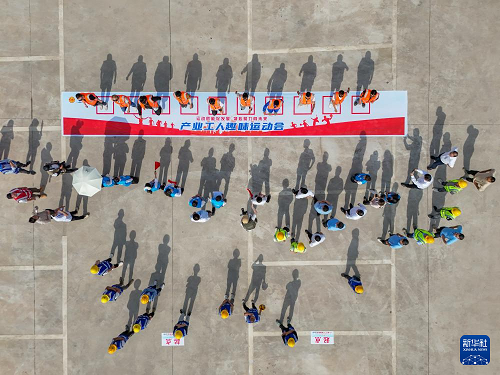 4月27日,工人們?cè)谶M(jìn)行原地踏步60秒比賽活動(dòng)(無人機(jī)照片)。(新華社記者 王曦 攝)