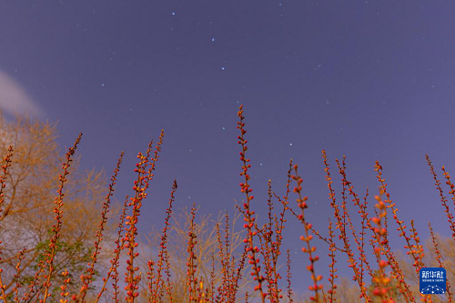 5月3日在黑龍江省佳木斯市富錦市錦山鎮(zhèn)拍攝的星空下的杏花。(新華社發(fā) 曲玉寶 攝)