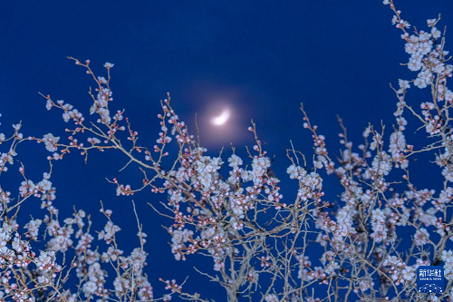 5月1日在黑龍江省大慶市杜爾伯特蒙古族自治縣境內(nèi)的多克多爾山景區(qū)拍攝的彎月下盛開的杏花。(新華社發(fā) 劉大鵬 攝)