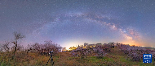 5月2日在黑龍江省大慶市杜爾伯特蒙古族自治縣境內(nèi)的多克多爾山景區(qū)拍攝的銀河和盛開的杏花(拼接照片)。(新華社發(fā) 劉大鵬 攝)