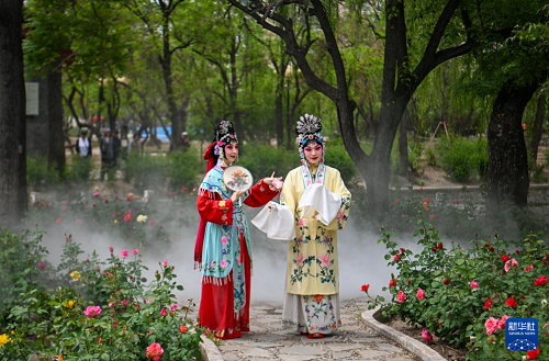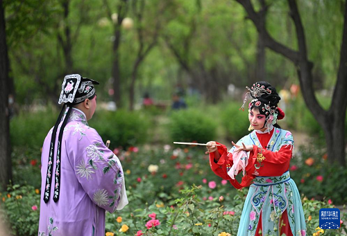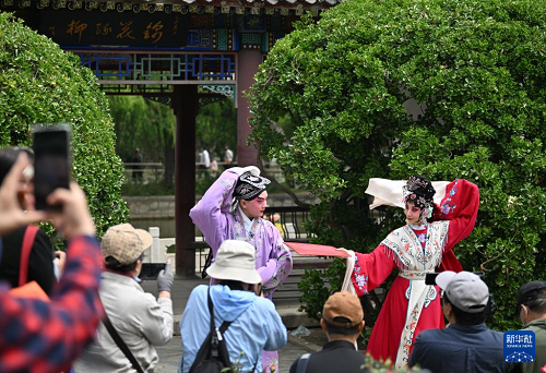 5月5日,演員在天津人民公園為觀眾表演京劇《西廂記》。(新華社記者 孫凡越 攝)