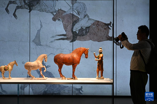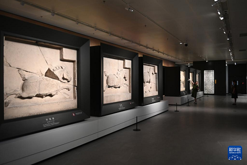 5月12日,游客在改擴建后的西安碑林博物館北區(qū)場館參觀昭陵六駿石雕。(新華社記者 李一博 攝)