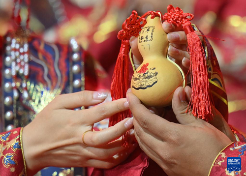 5月21日,一對新人在集體婚禮上進行結發(fā)禮環(huán)節(jié)。(新華社記者 趙子碩 攝)