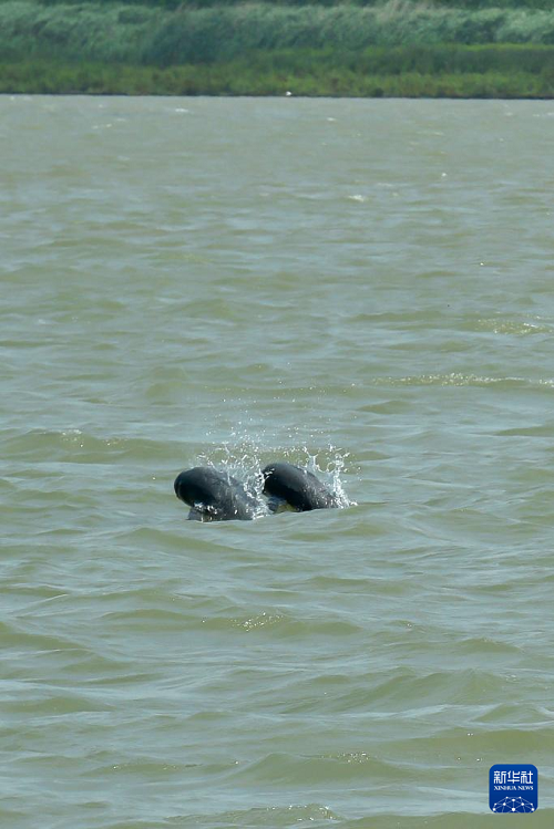 5月21日,在長江銅陵段的江面上,野生江豚躍出水面。(新華社發(fā) 儲著傳 攝)