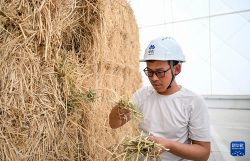 5月22日,技術人員在赤峰市阿魯科爾沁旗的現(xiàn)代化牧草儲備庫中查看牧草品質。(新華社記者 彭源 攝)