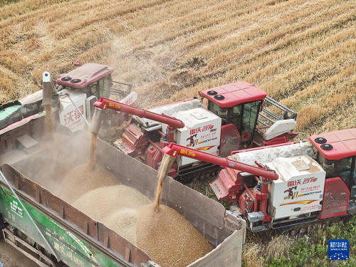 在盱眙縣種糧大戶劉凱的承包田旁,收割機(jī)將小麥裝車(5月27日攝,無人機(jī)照片)。(新華社記者 季春鵬 攝)