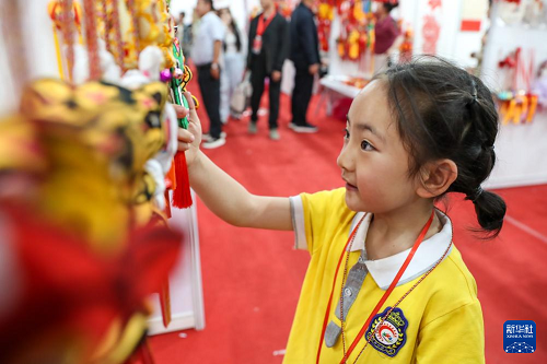 5月29日,小朋友在慶陽(yáng)香包民俗文化節(jié)非遺沉浸體驗(yàn)區(qū)挑選香包。(新華社記者 郎兵兵 攝)