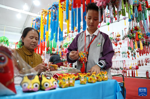 5月29日,在慶陽(yáng)香包民俗文化節(jié)非遺沉浸體驗(yàn)區(qū),一名學(xué)生放學(xué)后幫忙整理自家攤位上的香包。(新華社記者 郎兵兵 攝)