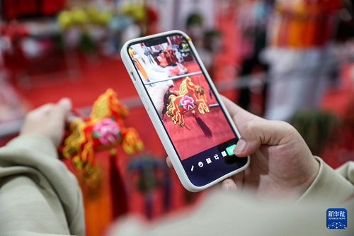 5月29日,市民在慶陽(yáng)香包民俗文化節(jié)非遺沉浸體驗(yàn)區(qū)拍攝生肖“馬”香包。(新華社記者 郎兵兵 攝)
