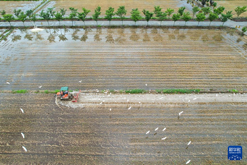 6月2日,浙江省湖州市德清縣乾元鎮(zhèn)村民駕駛犁田機械翻耕農(nóng)田,為栽插晚稻秧苗做準備(無人機照片)。(新華社發(fā) 姚海翔 攝)