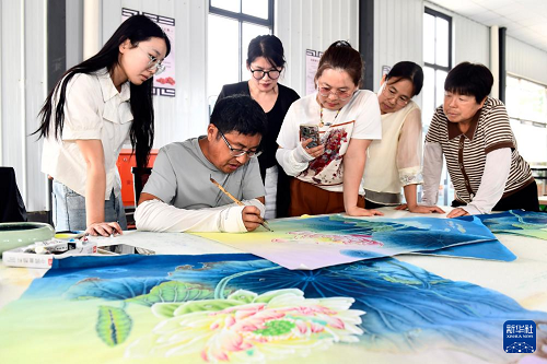 6月2日,在巨野縣龍堌鎮(zhèn)龍海書畫院,農(nóng)民畫師在創(chuàng)作工筆畫。(新華社記者 郭緒雷 攝)