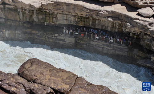 夏日時(shí)節(jié),在位于晉陜交界處的黃河壺口瀑布景區(qū),氣勢(shì)磅礴的黃河水如萬(wàn)馬奔騰,壯美景觀吸引游人駐足游覽。
