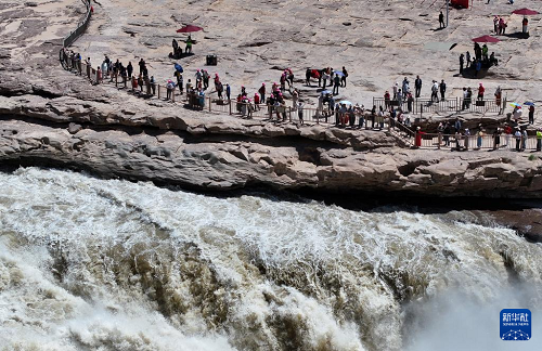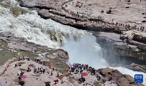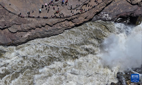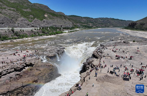 6月4日,游客在位于晉陜交界處的黃河壺口瀑布景區(qū)參觀(無(wú)人機(jī)照片)。(新華社記者 張博文 攝)
