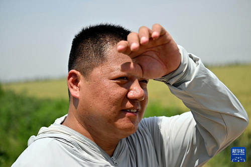 在永濟(jì)市虞鄉(xiāng)鎮(zhèn)麥田里,賈俊杰查看小麥時(shí)擦去額頭上的汗水(5月21日攝)。(新華社記者 詹彥 攝)