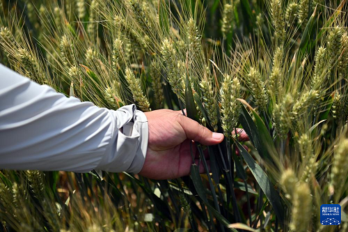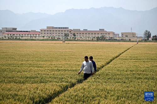 賈俊杰(前)和農(nóng)業(yè)技術(shù)員在麥田里查看小麥生長(zhǎng)情況(5月21日攝)。(新華社記者 詹彥 攝)