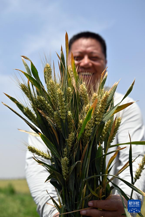 在永濟(jì)市虞鄉(xiāng)鎮(zhèn)麥田里,賈俊杰展示沉甸甸的麥穗(5月21日攝)。(新華社記者 詹彥 攝)