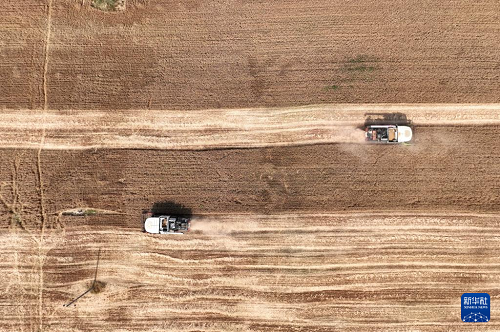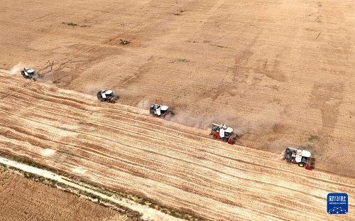 6月12日,收割機(jī)在河北省邢臺市隆堯縣雙碑鄉(xiāng)西良村麥田里收獲小麥(無人機(jī)照片)。(新華社記者 牟宇 攝)