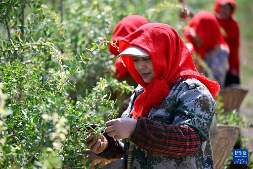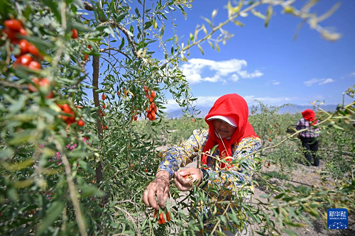6月15日,采摘工在百瑞源殷紅子熟枸杞莊園采摘頭茬枸杞。(新華社記者 王鵬 攝)
