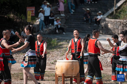 7月7日,在恩施州巴東縣三里城哨棚頂景區(qū),當(dāng)?shù)氐耐良易宕迕駷橛慰捅硌荨叭鋈~兒嗬”舞蹈。(新華社記者 伍志尊 攝)