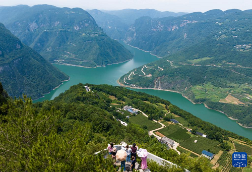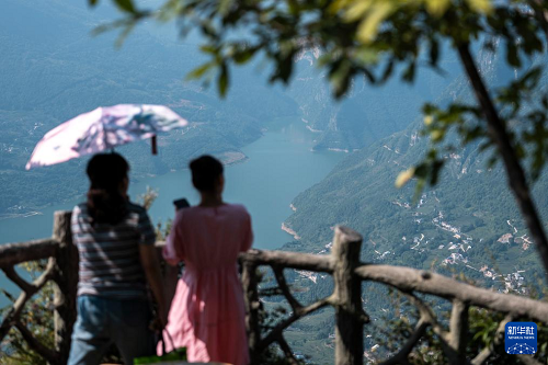 7月7日,在恩施州巴東縣水布埡鎮(zhèn),游客欣賞十字江風(fēng)光(無人機(jī)照片)。(新華社發(fā) 鄭家裕 攝)