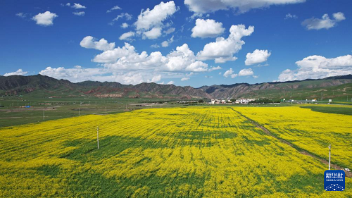 7月10日在桑科草原拍攝的油菜花海(無人機照片)。(新華社記者 魚瀾 攝)