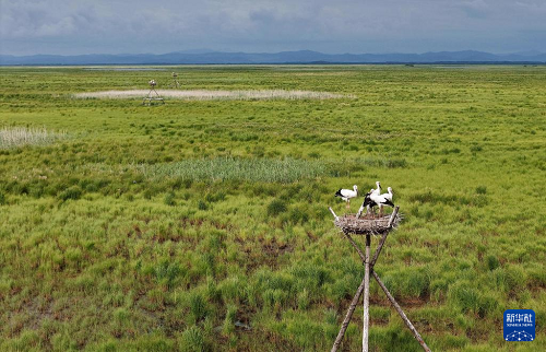 7月13日,在黑龍江三環(huán)泡國(guó)家級(jí)自然保護(hù)區(qū),東方白鸛在人工巢中活動(dòng)(無人機(jī)照片)。(新華社發(fā) 曲玉寶 攝)
