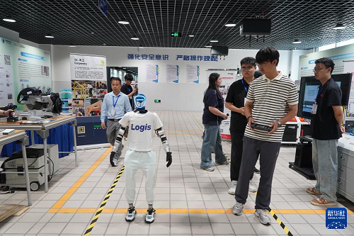 7月15日,在第二屆江蘇青年技能周活動(dòng)期間,技術(shù)人員在江蘇省技工教育成果要素展上操控人形機(jī)器人。(新華社發(fā) 劉臻睿 攝)