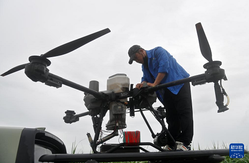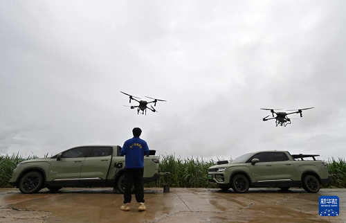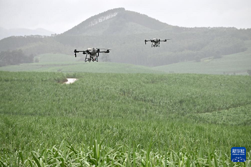 7月23日,在位于廣西上思縣的昌菱農(nóng)場蔗區(qū),技術(shù)人員操控?zé)o人機(jī)。(新華社記者 陸波岸 攝)