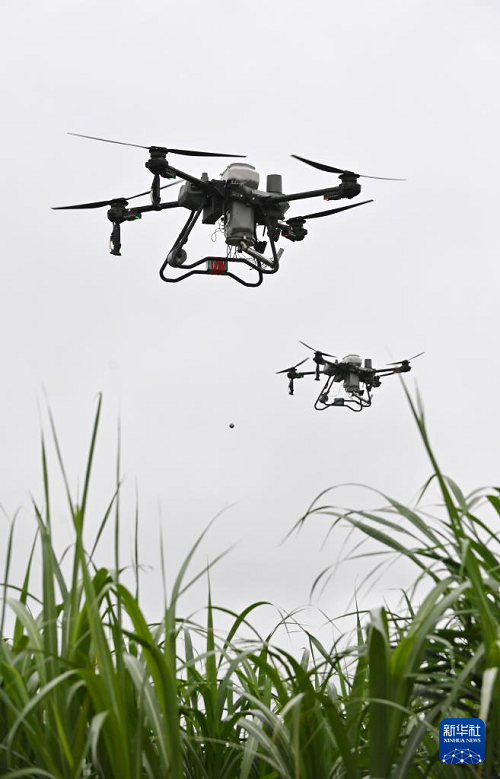 7月23日,在位于廣西上思縣的昌菱農(nóng)場蔗區(qū),無人機(jī)在飛行中釋放螟黃赤眼蜂球。(新華社記者 陸波岸 攝)