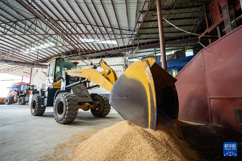 7月24日,在常德市鼎城區(qū)雙橋坪鎮(zhèn)一個水稻烘干工廠,工人駕駛鏟車把稻谷放入烘干設(shè)備。(新華社記者 周勉 攝)