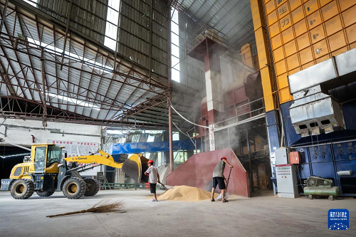 7月24日,在常德市鼎城區(qū)雙橋坪鎮(zhèn)一個水稻烘干工廠,國網(wǎng)常德供電公司電力工人在檢查烘干設(shè)備電力供應(yīng)情況。(新華社記者 陳思汗 攝)